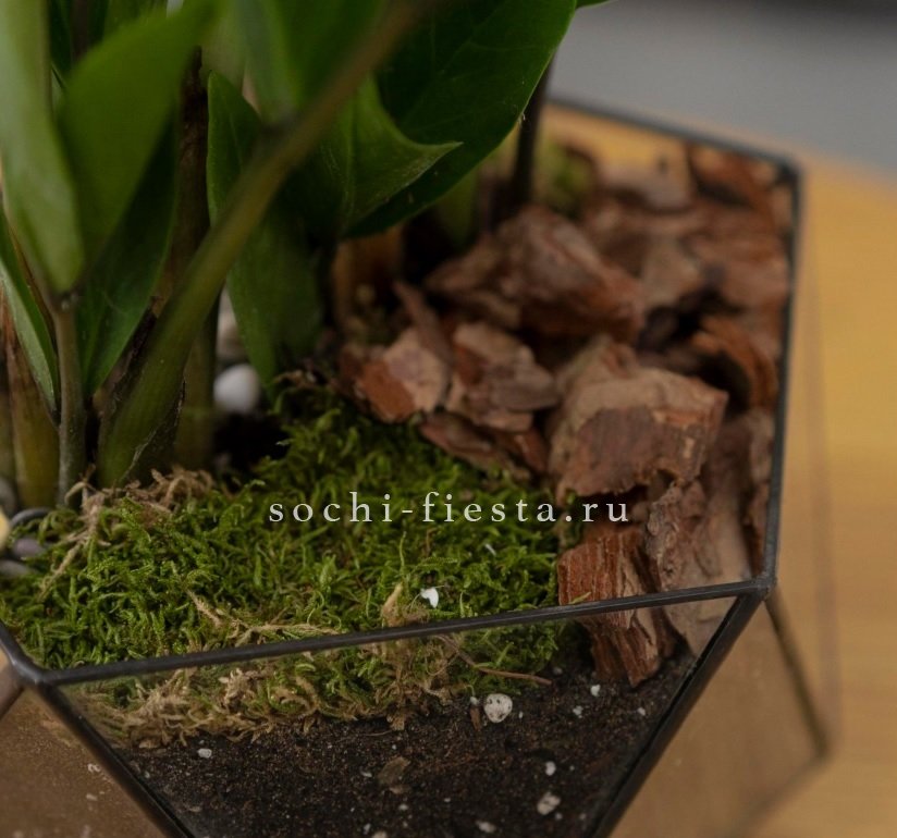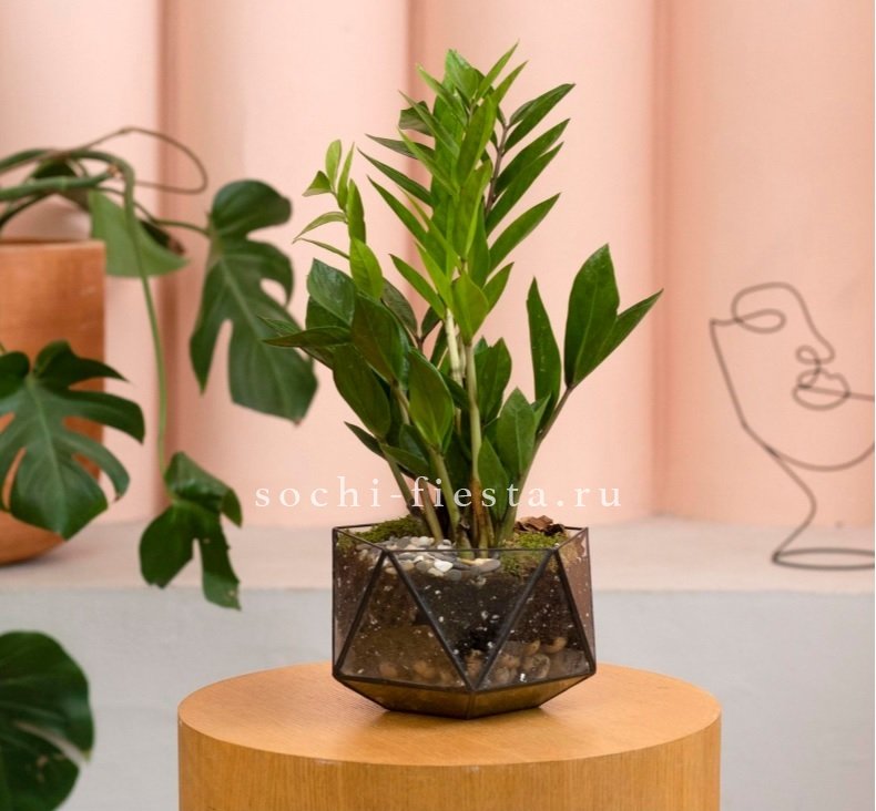 Замиокулькас в многогранном кашпо-икосаедре притягивает взгляд строгой геометрией. Плотные глянцевые листья сохраняют насыщенный цвет даже при редком поливе.